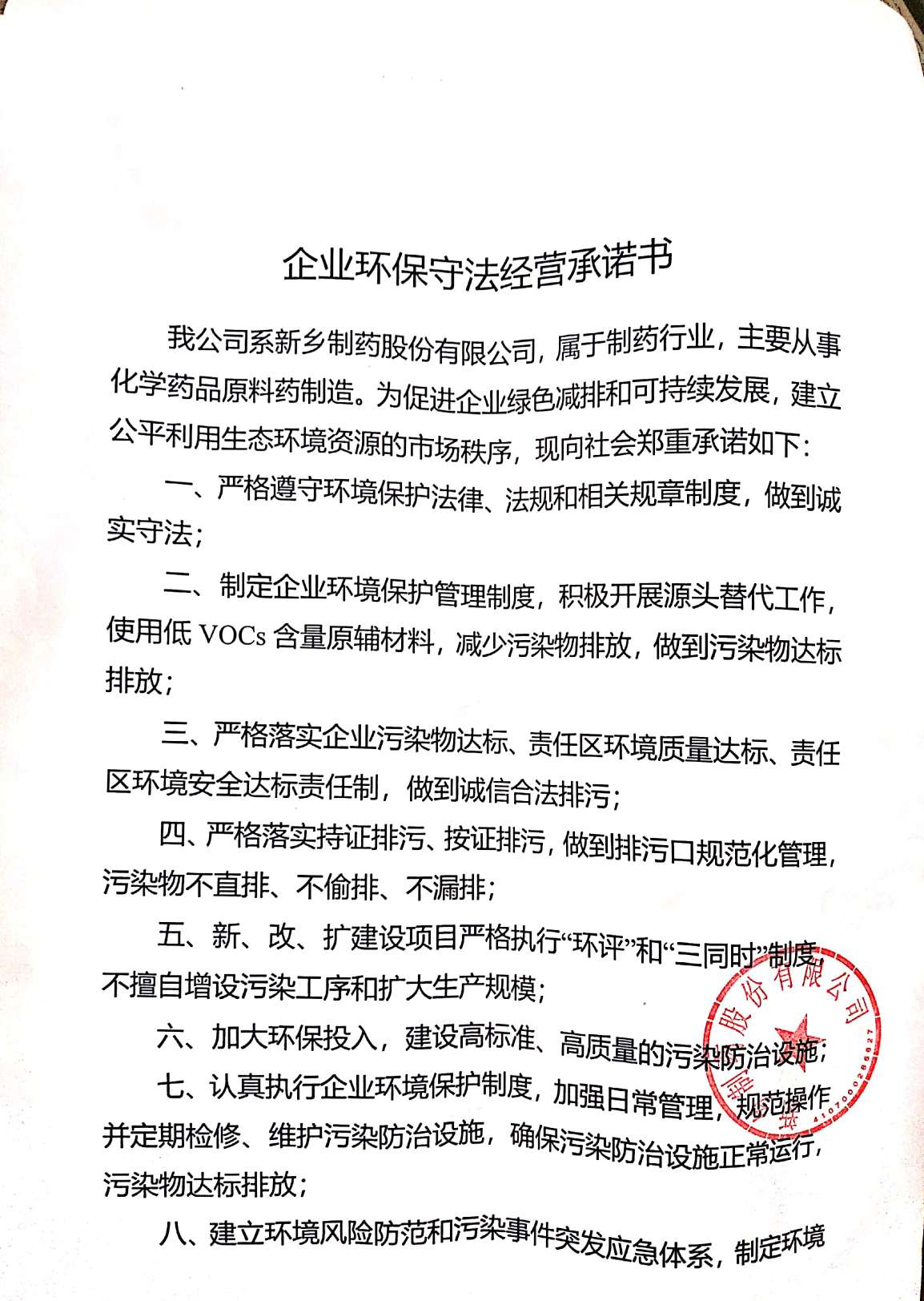 企业环保守法经营承诺书